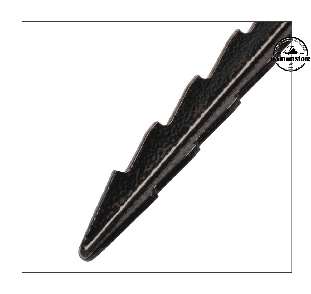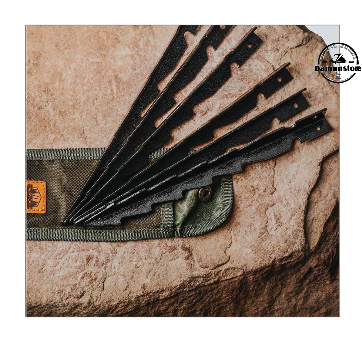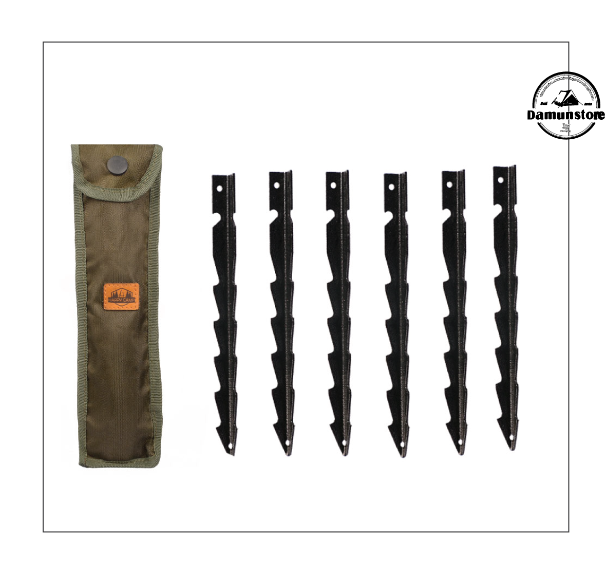 میخ چادر 15 سانتی هپی کمپ، مجموعه 6 عددی ساخته شده از جنس ورق آهن دو میل و دارای یک کیف برزنتی برای حمل راحت تر می باشد. این میخ به صورت کنگره ای جهت درگیر شدن بیشتر در سطوح سخت طراحی شده است.