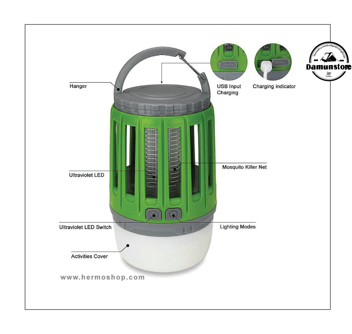 دفع پشه: این چراغ با استفاده از نور فرابنفش 360 تا 400 نانومتر، پشهها را جذب کرده و با شبکه 1200 ولت خود آنها را از بین میبرد و محیطی عاری از پشه ایجاد میکند.